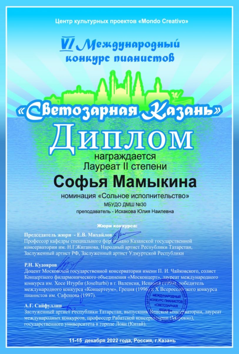 VI Международный конкурс пианистов "Светозарная Казань" - Мамыкина Софья - II место