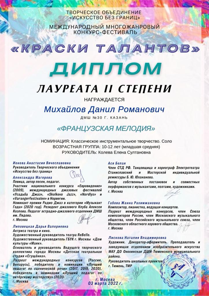 Международный многожанровый конкурс-фестиваль "Краски талантов" - Михайлов Данил - II место