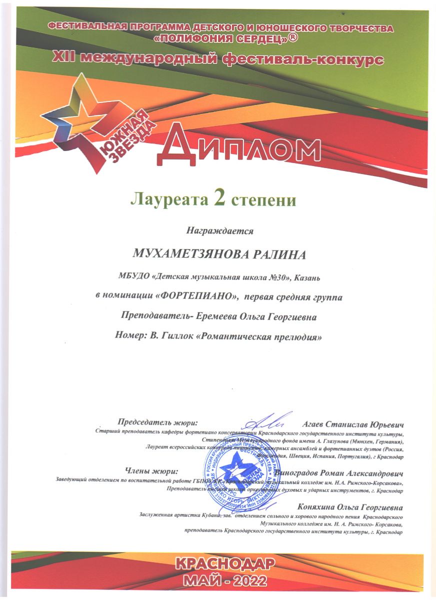 XII Международный фестиваль-конкурс "Южная звезда" - Мухаметзянова Ралина - II место