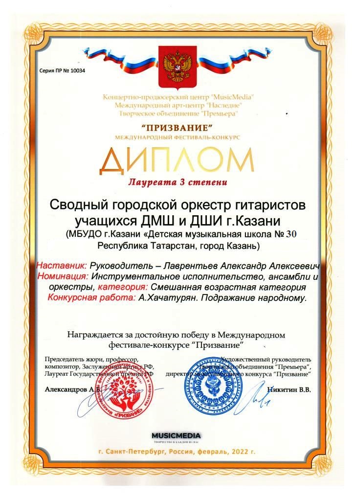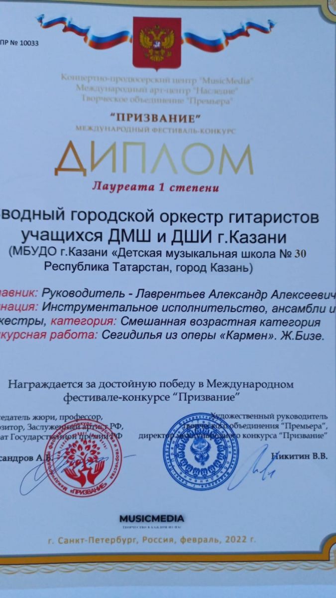 Международный фестиваль-конкурс "Призвание" - ансамбль гитаристов - I место