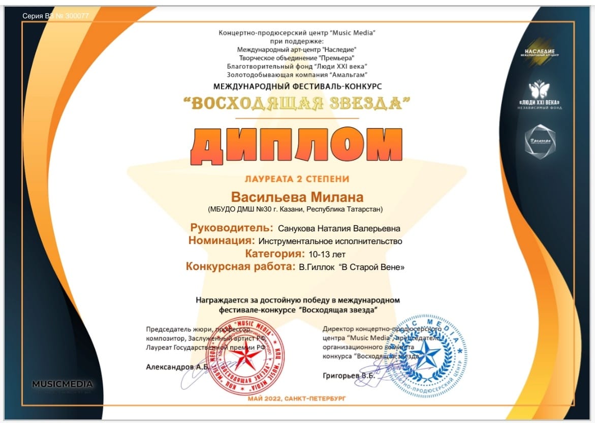 Международный фестиваль-конкурс "Восходящая звезда" - Васильева Милана - II место