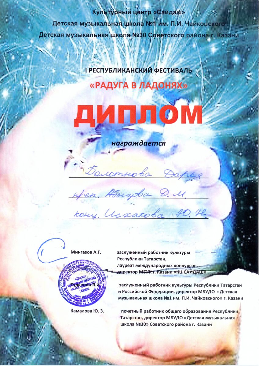I Республиканский фестиваль "Радуга в ладонях" - Болотнова Дарья - диплом