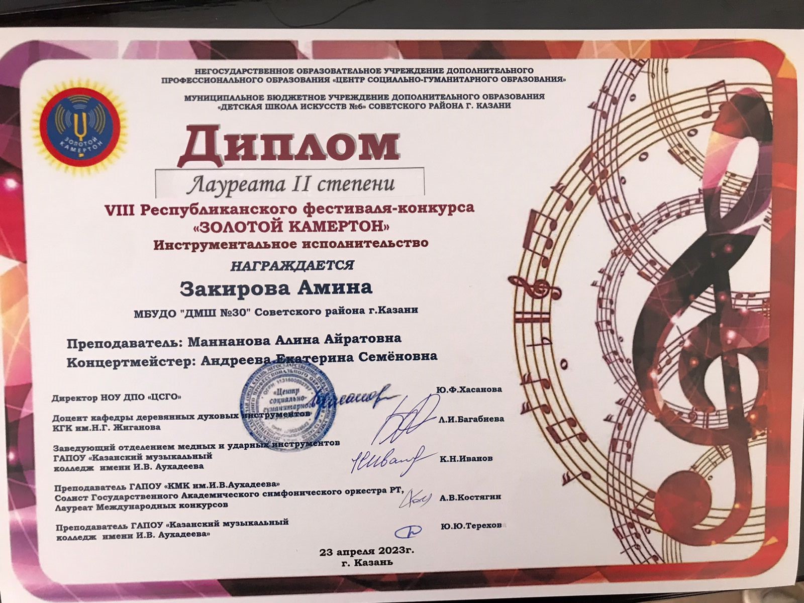 VIII Республиканский фестиваль-конкурс "Золотой камертон" - Миннеханова Дина - дипломант