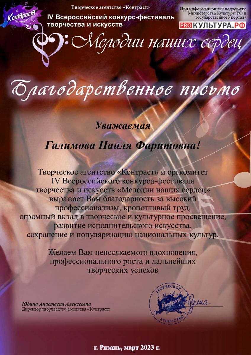 XIV Всероссийский фестиваль-конкурс "Дорога к успеху" - Галимова Н.Ф. - Благодарственное письмо