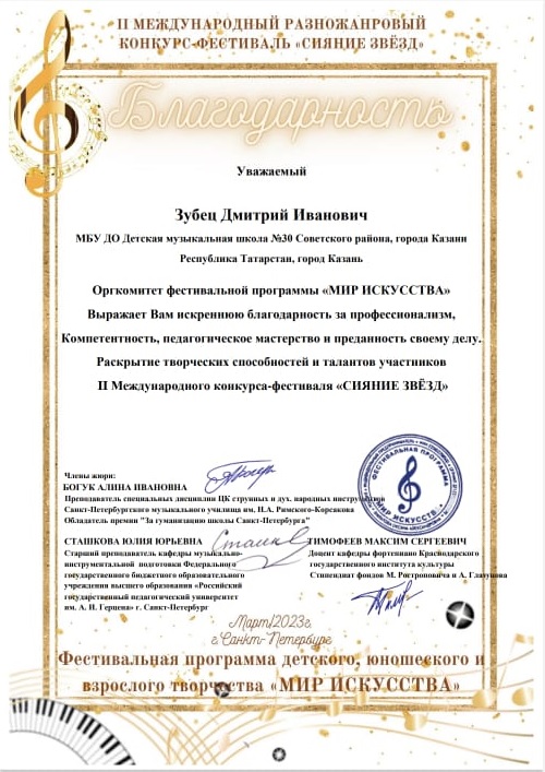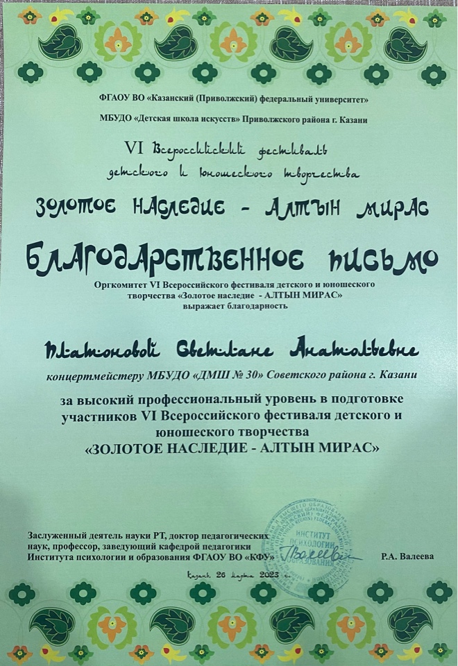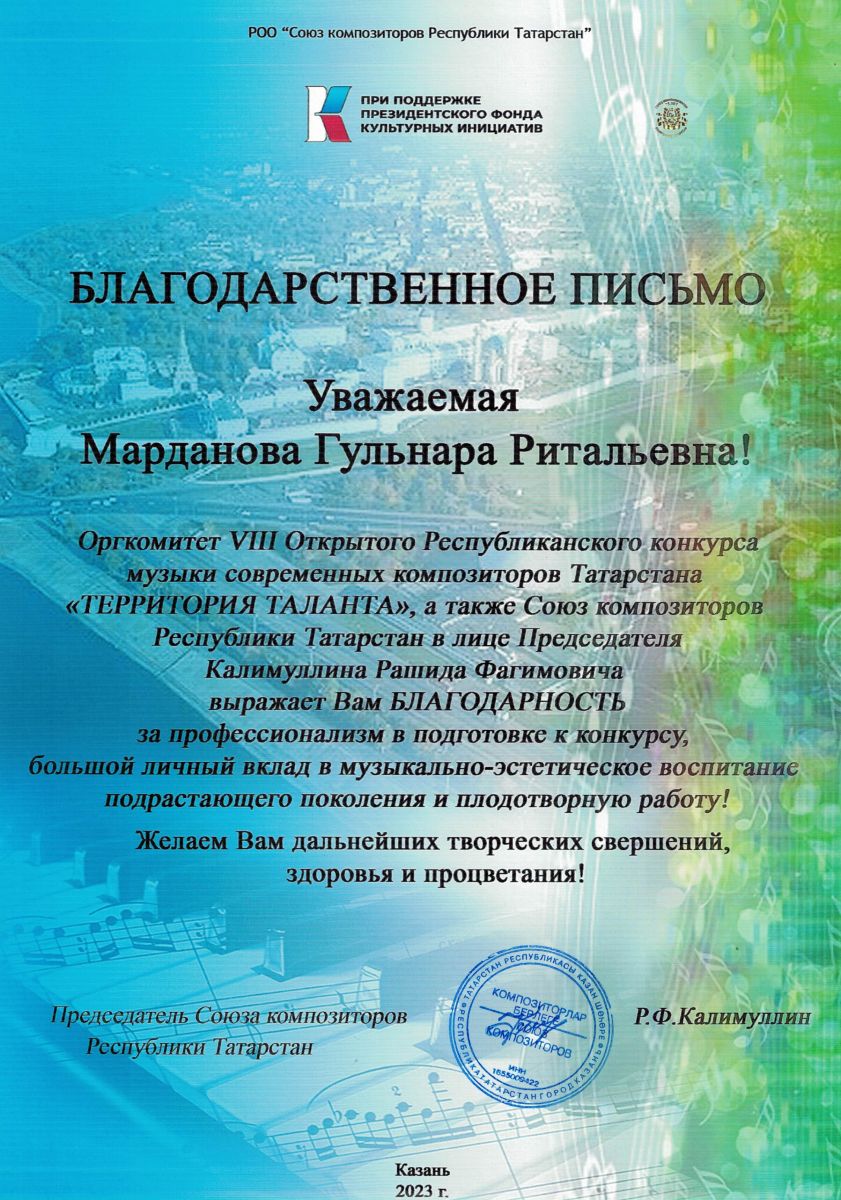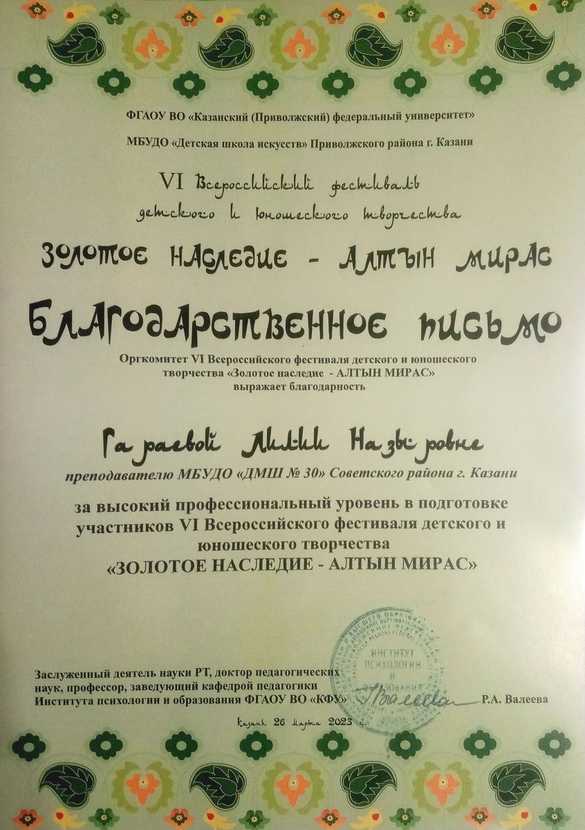 Международный фестиваль-конкурс искусств "Олимп 2023" - Мугалимова Г.М. - Благодарственное письмо
