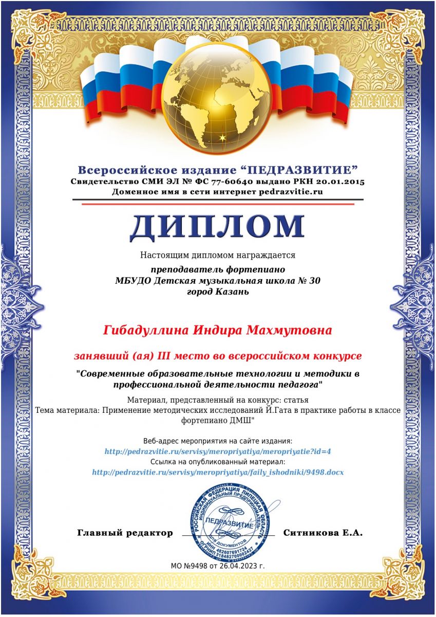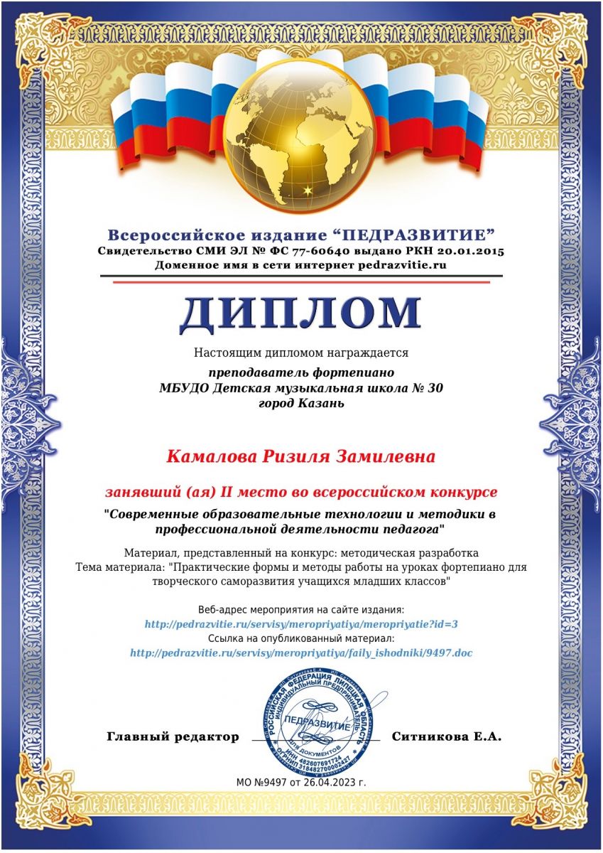 XVI Всероссийский педагогический конкурс "Высокий результат" - Камалова Ю.З. - I место
