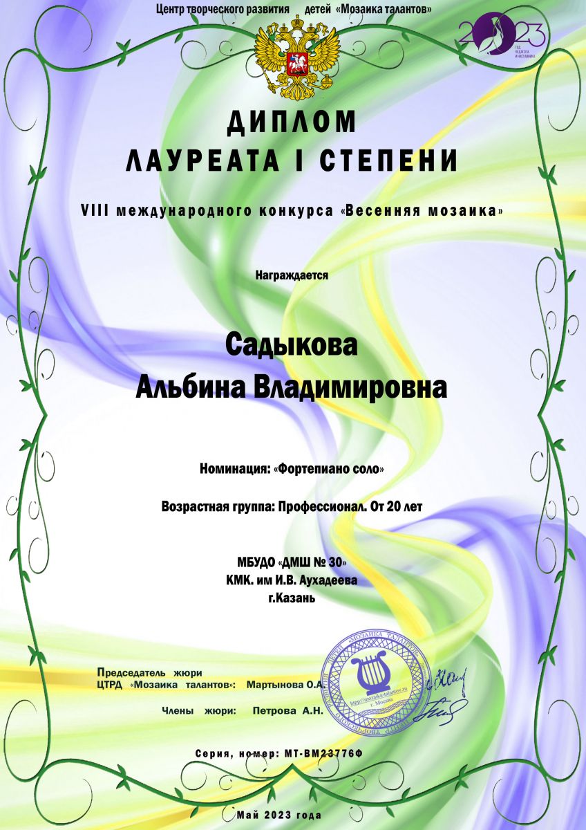 VIII Международный конкурс "Весенняя мозаика" - Садыкова А.В. - I место