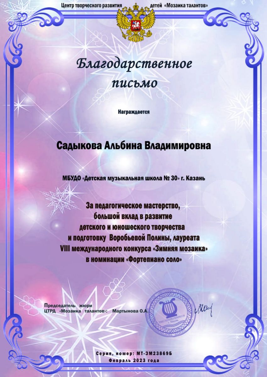 VIII Международный конкурс "Зимняя мозаика" - Садыкова А.В. - Благодарственное письмо