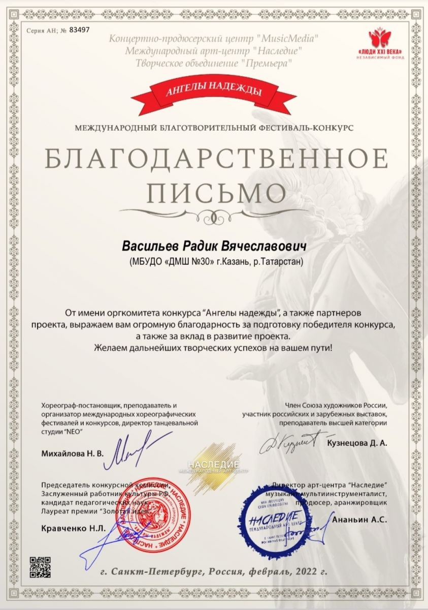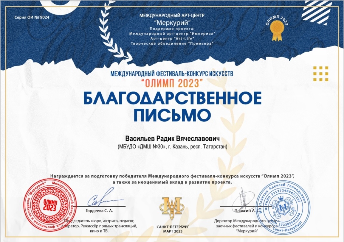 Международный фестиваль-конкурс искусств "Олимп-2023" - Васильев Р.В. - Благодарственное письмо