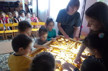 Сегодня у нас в гостях была "Песочное шоу" со сказкой "Колобок" и "Дюмовочка". Дети слушали сказку и смотрели на экран, как художница Юлия рисовала сказку. А потом ребятки сами пробавали рисовать. Им очень понравилось рисовать с песочком.