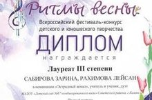 Поздравляем лауреатов III степени Всероссийского фестиваля - конкурса детского и юношеского творчества "Ритмы весны" Сабирову Зарину и Рахимову Лейсан Айратовну в номинации "Эстрадный вокал", учитель - ученик, дуэт. Молодцы!!!