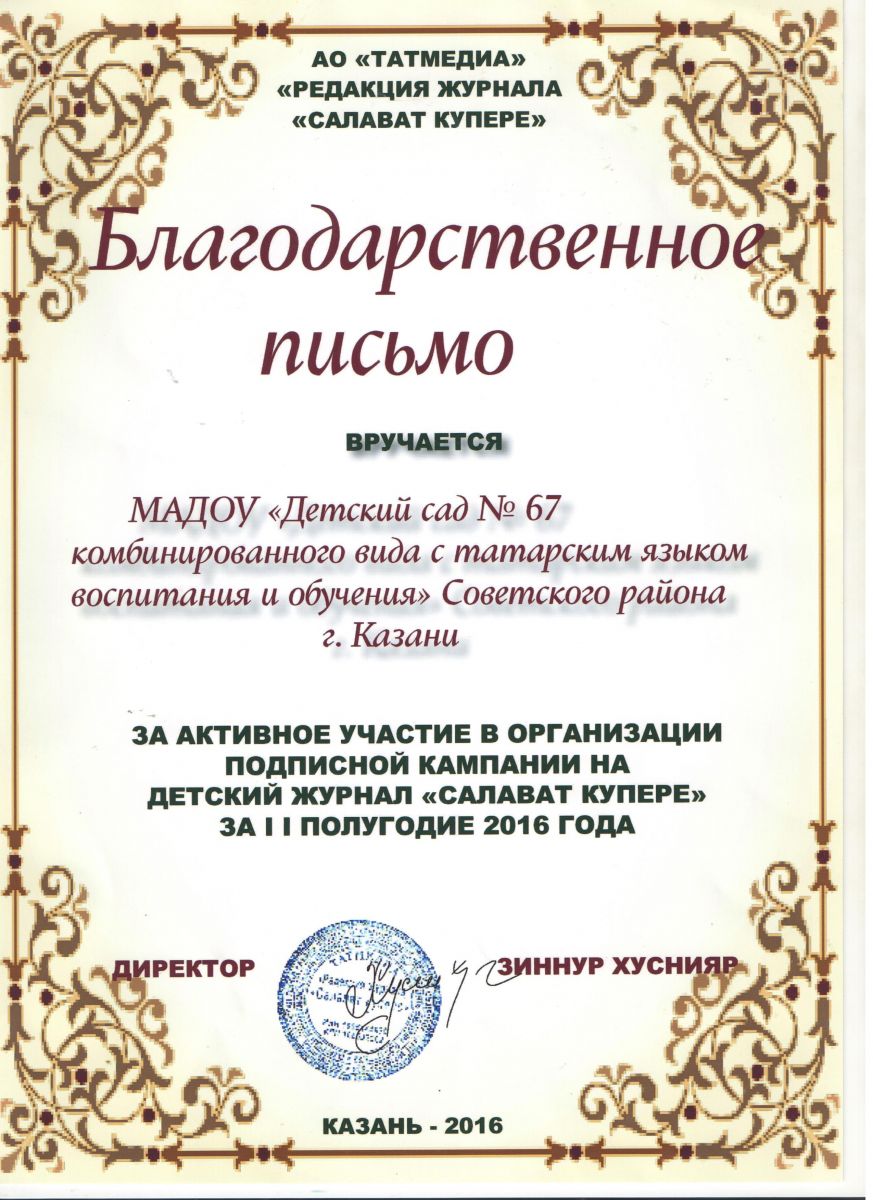 Благодарственное письмо детского журнала "Салават купере"