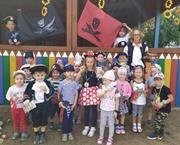 В нашем детском саду прошёл квест - праздник «Пиратская вечеринка». Этому предшествовала предварительная работа с детьми и родителями. Ребята пришли в детских сад в тельняшках и банданах, полосатых футболках с атрибутами для игр. Воспитатель Альбина Ильшатовна Хусаинова написала сценарий мероприятия, нарисовала пиратский флаг, сделала сундук с сокровищами, оформила участок детского сада флагами, нарисовала «старинную карту», подготовила музыкальное сопровождение для танцев. Ребята прошли посвящение в пираты: доказали, что они самые ловкие, меткие; произнесли клятву, сделали разминку. Собирая кусочки карты, маленькие пираты откапывали ключи в песке, на ощупь искали сокровища, собирали морских рыб, играли в игры «Морской узел», «Эрудиты».