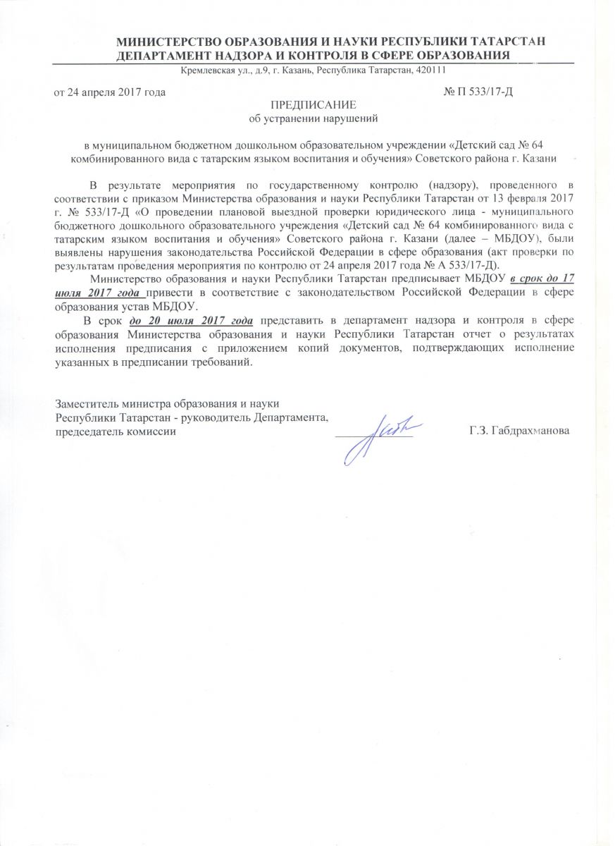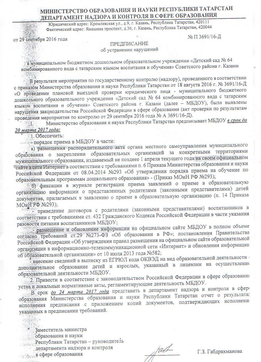 ответ на предписание департамента надзора и контроля в сфере образования