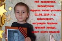 Я помню! Я горжусь! Забирова Мадина, воспитанница подготовительной к школе группы №12 рассказала про своего прадедушку Ахтямова Сабира Ахтямовича, участника Великой Отечественной войны. За проявленное мужество и отвагу он был награжден орденом "Красной Звезды", представлен к званию Героя Советского Союза (ему тогда было 18 лет). В городе Казани МАОУ "Лицей №121" носит имя Героя Советского Союза Ахтямова С.А.