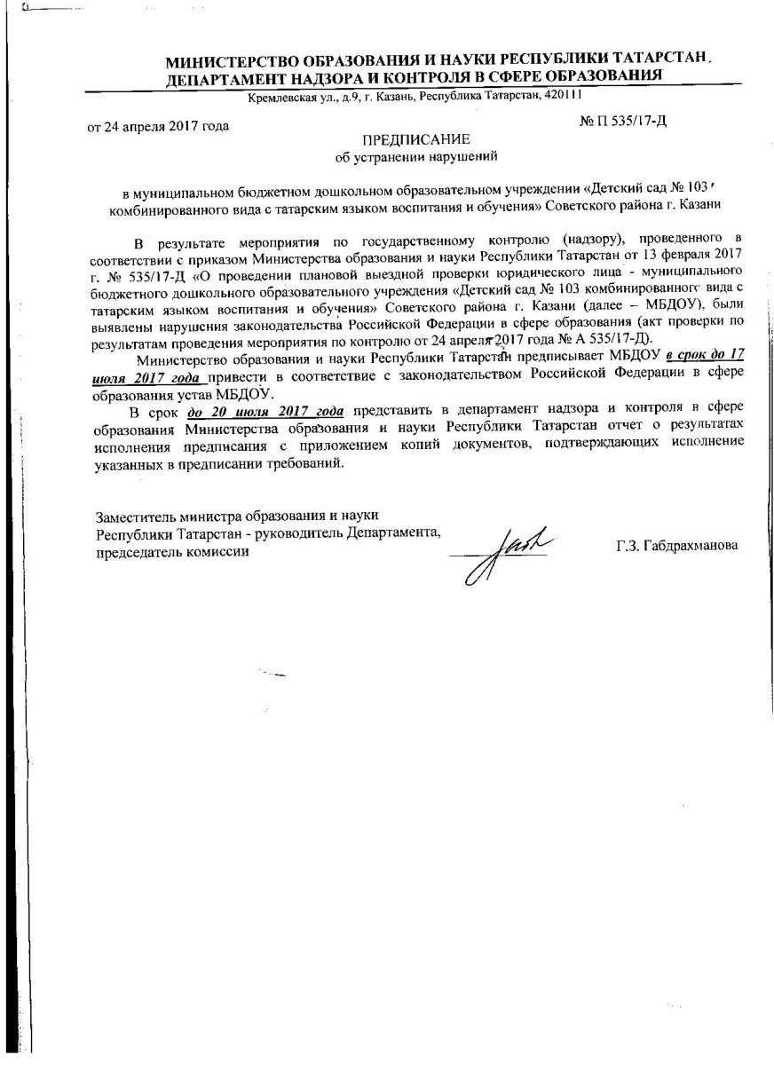 Предписание об устранении нарушений от 24.04.2017г