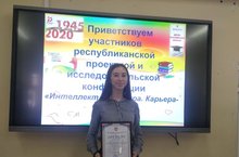 8 февраля в День науки на базе МБОУ «Гимназия 90» прошла Республиканская проектная и исследовательская конференция школьников «Интеллект. Культура. Карьера». Каримова Назиля, ученица 8б класса, достойно защитила свою исследовательскую работу и заняла 2 место (учитель-консультант Р.А.Усманова). Поздравляем с победой!