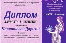 Поздравляем учащуюся 6 класса Чартинову Дарьяну и ее педагога Садовникову Елену Николаевну с первым местом на международной олимпиаде по сольфеджио "Доминанта"! Желаем новых побед и высоких результатов!