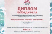 Поздравляем!!! 16.11.2015 Фахрутдинову Альбину Равильевну с присуждением Диплома III Степени в Всероссийском конкурсе «Гордость России», Диплома I места Всероссийского конкурса «Созвездие талантов» и Диплом II место в Всероссийском конкурсе методических разработок «Лира». МОЛОДЕЦ!!!