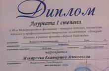 Поздравляем Макаренко Екатерину с присуждением звания Лаурета I степени в 48-ом Международном фестивале-конкурсе детских, юношеских, взрослых и профессиональных творческих коллективов "Колорит Казани"