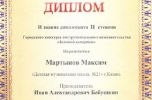 Мартынова Максима с присуждением звания Дипломанта II степени в Городском конкурсе инструментального исполнительства «Золотой камертон» в номинации «Духовые и ударные инструменты» среди учащихся ДМШ и ДШИ, преподаватель Бабушкин И.А., концертмейстер Демина А.А.