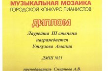 Уткузову Амалию,класс преподавателя Смирновой А.В., с присуждением в Городском фестиваль-конкурсе юных пианистов «МУЗЫКАЛЬНАЯ МОЗАИКА» звания Лауреата III степени. Молодец!!!