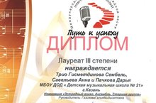 Лауреата III степени Трио Пачкова Даша, Савельева Аня и Гисметдинова Сембель, класс преподавателя Газизовой Г. М.