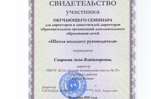 30 января 2015 года в ГБУ ДО "Республиканский центр внешкольной работы" состоялся обучающий семинар "Школа молодого руководителя" для директоров и заместителей директоров образовательных организаций дополнительного образования детей. Участниками семинара от нашей школы стали директор – Смирнова Анна Владимировна и зам.директора по УВР – Акчурина Роза Салихьяновна. На семинаре были рассмотрены вопросы обновления концептуальной и нормативно-правовой базы дополнительного образования детей, подведены итоги первой половины 2014-2015 учебного года.
