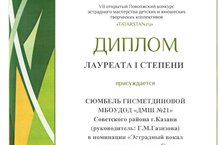 Хачатурян Анаит - Лауреата III степени,класс преподавателя Газизовой Г.М.Гисметдинова Сембель - Лауреата I степени, класс преподавателя Газизовой Г.М.Дуэт Пачкова Даша и Савельева Аня - Лауреата I степени, класс преподавателя Газизовой Г.М.Трио Пачкова Даша, Савельева Аня и Гисметдинова Сембель - Лауреата III степени, класс преподавателя Газизовой Г.М.Журнал о лучших вокалистах "Я пою" 15.01.2015