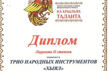 Галимуллину Камилу с присуждением звания "ЛАУРЕАТА II СТЕПЕНИ" в номинации "Эстрадный вокал", а также трио "Хыял"- Галимуллину Камилу, Назмиева Рамазана и Якупову Камилу с присуждением звания "ЛАУРЕАТА II СТЕПЕНИ" в номинации интрументальный жанр в конкурсе- фестивале в рамках международного проекта "На крыльях таланта"