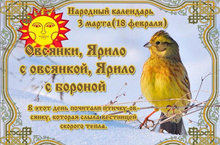 3 марта отмечается большой народный праздник Ярило с овсянкой.Наши предки считали,что в этот день бог плодородия Ярило брался за соху и борону- проверял,готовы ли они к весне, - и растапливал снег,поэтому первые весенние ручейки сулили быструю,дружную весну и хороший урожай.