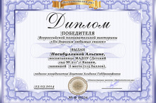 Сегодня были подведены итоги всероссийского интернет конкурса "По дорогам любимых сказок" и по результатам конкурса воспитанницы детского сада Хазиева Азалия и Насибуллина Альсина заняли 1 место набрав 115 баллов. Поздравляем девочек с победой!!!