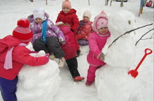 Дети средней татарской группы слепили замещательного снеговика и чудесную гусеницу. Теперь все дружно играют и катаются на чудо-гусенице.