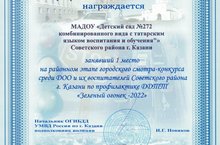 Наш детский сад занял 1 место на районном этапе городского смотра – конкурса среди ДОО и их воспитателей Советского района г. Казани по профилактике детского дорожно –транспортного травматизма «Зеленый огонек -2022»!
