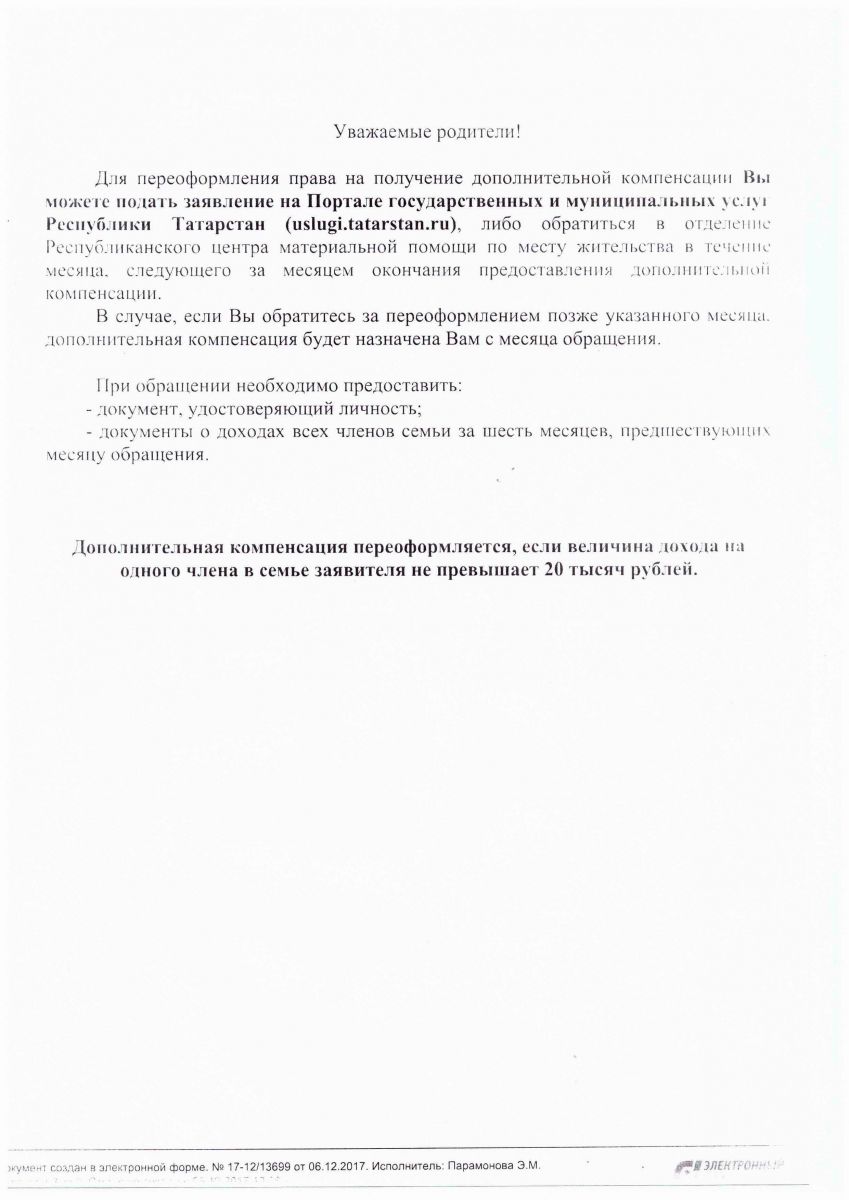 Памятка для родителей на переоформление дополнительной компенсации 14.12.2017