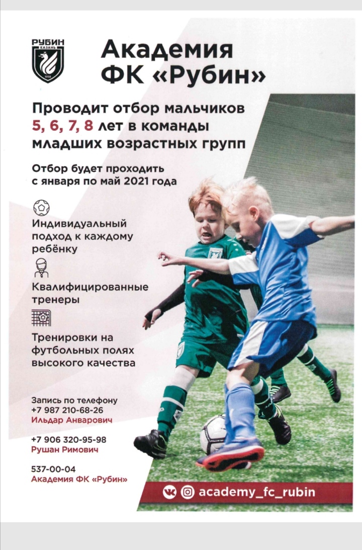 Академия ФК "Рубин" проводит отбор мальчиков 5,6,7,8 лет в команды младших возрастных групп . Отбор будет проходить с января по май 2021 года. Запись по телефону +7 987 210-68-26 Ильдар Анварович