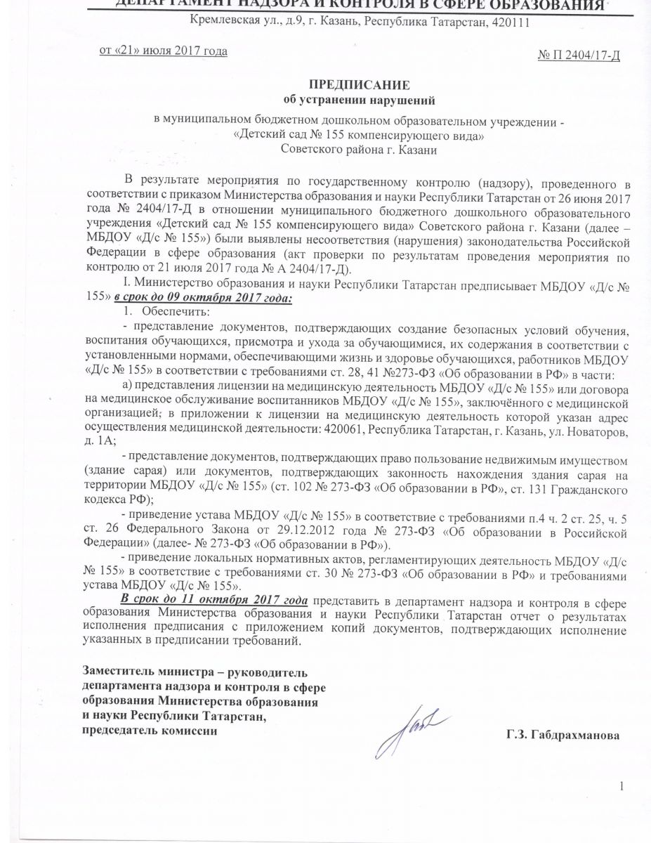 Предписание (Департамента надзора и контроля в образовательной сфере) от 21.07.2017 года