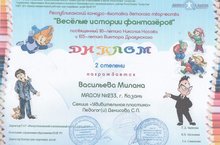 Среди творческих работ участников заочного этапа выставки – конкурса «Весёлые истории фантазёров» от 12.02.2018г в номинации «Удивительная пластика» (5-7 лет) (поделки из пластилина, соленого теста, глины и т.п.) была отмечена работа и нашей воспитанницы Васильевой Миланы од руководством воспитателя Денисовой С.П. и удостоена диплома 2 степени. Выражаем искрение поздравления победителям.
