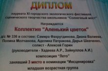 Диплом лаурета ХI городского экологического фестиваля сценического творчества школьников "Солнечный мост" 27.12.2016