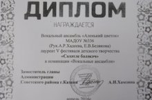 Поздравляем вокальный ансамбль "Аленький цветок" под руководством нашего музыкального руководителя Хадеевой А.Р. с присуждением звания Лауреат 5 фестиваля детского творчества "Талантливый малыш" в номинации "Вокальные ансамбли".
