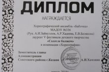 Поздравляем хореографический ансамбль "Бабочка" под руководством нашего музыкального руководителя Хадеевой А.Р. и хореографа Зайнуллова А.И. с присуждением звания лауреат 5 фестиваля детского творчества Талантливый малыш" в номинации "Хореография".