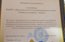 Благодарственными письмами ФГАОУ ВПО «Казанский (Приволжский) федеральный университет» Приволжского межрегионального центра повышения квалификации и профессиональной переподготовки работников образования Республики Татарстан за плодотворное сотрудничество в сфере повышения квалификации и профессиональной переподготовки учителей-логопедов и дефектологов коррекционных учреждений Республики Татарстан отмечены заведующая детского сада Захматова Антонина Петровна, старший воспитатель Паткина Надежда Владимировна, учителя-логопеды Борисова Наталья Александровна, Шернина Светлана Викторовна, Набиуллина Регина Радиковна, Михайлова Наталья Владимировна.Сотрудники центра в лице директора ПМЦ ПК и ППРО Р.Ф. Шайхелисламова выразили глубокую признательность за совместную работу по организации стажировки для слушателей курсов, обмена опытом работы и действенную помощь в повышении профессионального роста учителей-логопедов.
