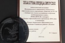 Победитель в конкурсе «Лучшее образовательное учреждение 2016 года» в номинации «Лучшее дошкольное образовательное учреждение Советского района г.Казани» 15.08.2016