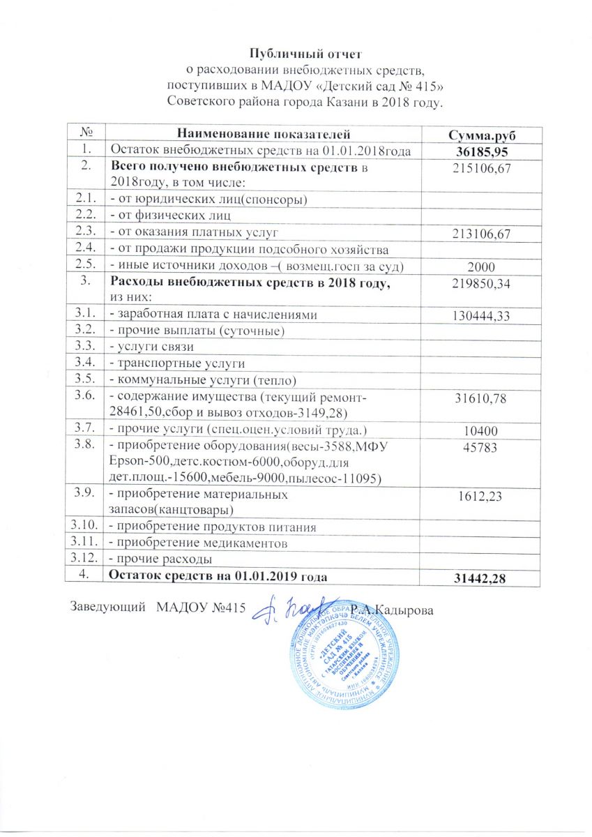 Отчет о привлечении и расходовании внебюджетных средств, поступивших в  МАДОУ "Детский сад № 415" в 2018 году