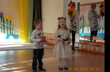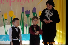 Поздравлять мам в средних группах №4 и № 12 помагал Петрушка, появившийся из коробки из-под торта. Фото в медиатеке.