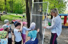 Сегодня в детском саду проводился традиционная игра, посвященная вопросам безопасности и экологии. Играли в игру по маршрутным листам средние, старшие и подготовительный группы. Всего работало 6 площадок. На фотографии площадка "Правила поведения в лесу"