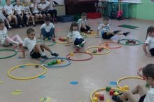 Спортивное развлечение для старших групп провела инструктор Швыркалова Н.А. Игра назхывалась "Путешествие по Космосу". На фотографии "Сбор космического мусора".