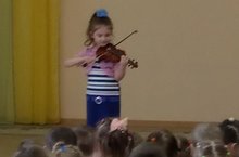 Выступает Динара. Она обучается в музыкальной школе. Всего на концерте выступило 34 ребенка.