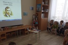 15 февраля в детском саду состоялось мероприятие, посвященное дню рождения Мусы Джалиля. В связи с этим в детском саду прошло литературное мероприятие посвящённый творчеству и подвигу татарского поэта, патриота, Героя Советского Союза. Организовали мероприятие воспитатели групп и воспитатель по обучению детей татарскому языку Садыкова Г.Р Педагоги рассказали о жизни и творчестве поэта – героя, о его соратниках. Прозвучали стихи, песни Мусы Джалиля в исполнении детей на татарском и русском языках. Дети узнали много нового и интересного. Они узнали о том, что Муса Джалиль – один из незабываемых представителей татарского народа. В 1941 году он пошел служить в Советскую Армию. В июне 1942 года получил тяжелое ранение и попал в концлагерь. Именно в плену им были написаны много стихов, которые полюбили народы нашей страны.
