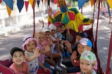 Сегодня в детский сад приехал веселый паравозик. Дети отправились в веселое путешествие. Во время путешествия вокруг детского сада все дети вспоминали детские веселые песни и пели их со своими воспитателями.